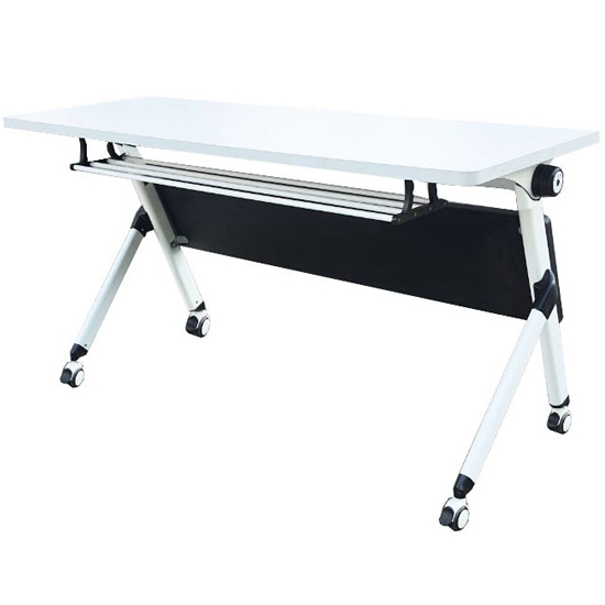 Bàn hội trường gấp mặt khung thép sơn trắng, mặt bàn gỗ M23 + yếm gỗ M26. Bàn gồm 4 bánh xe có khóa hãm, ngăn bàn có giá để tài liệu. Bàn thiết kế sử dụng cơ cấu gấp hiện đại, tiện dụng trong quá trình sử dụng. (Khung bàn nhập khẩu)