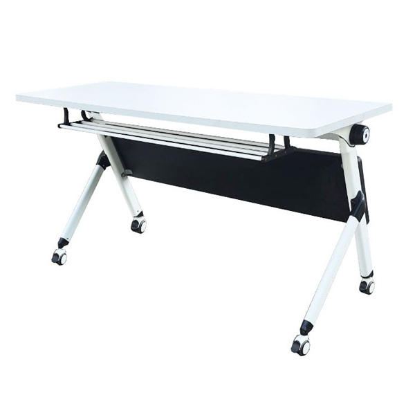 Bàn hội trường gấp mặt khung thép sơn trắng, mặt bàn gỗ M23 + yếm gỗ M26. Bàn gồm 4 bánh xe có khóa hãm, ngăn bàn có giá để tài liệu. Bàn thiết kế sử dụng cơ cấu gấp hiện đại, tiện dụng trong quá trình sử dụng. (Khung bàn nhập khẩu)