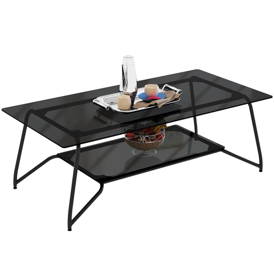 Bàn sofa khung thép sơn đen kết hợp mặt bàn kính cường màu xanh đen và một đợt kính để đồ phía dưới. Toàn bộ phần kính được bo tròn 4 góc tạo sự an toàn cho người sử dụng