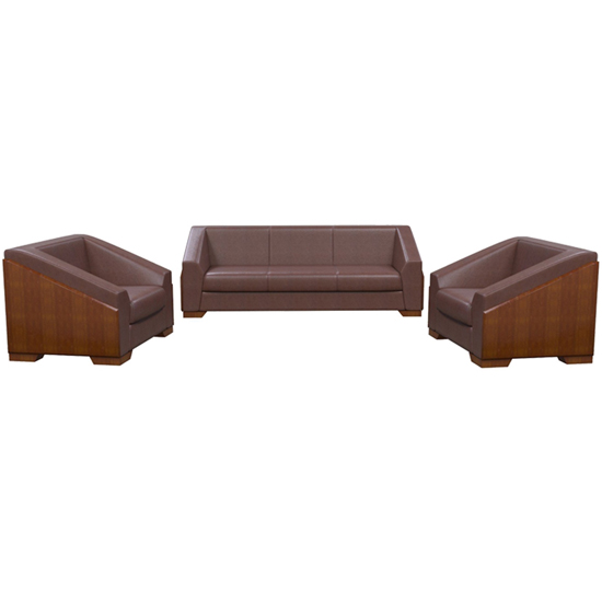 Bộ ghế sofa văn phòng cao cấp, đệm tựa bọc da thật phần tiếp xúc người sử dụng hoặc PVC. Đế chân và cạnh tay sử dụng ốp gỗ sơn có vát cạnh.