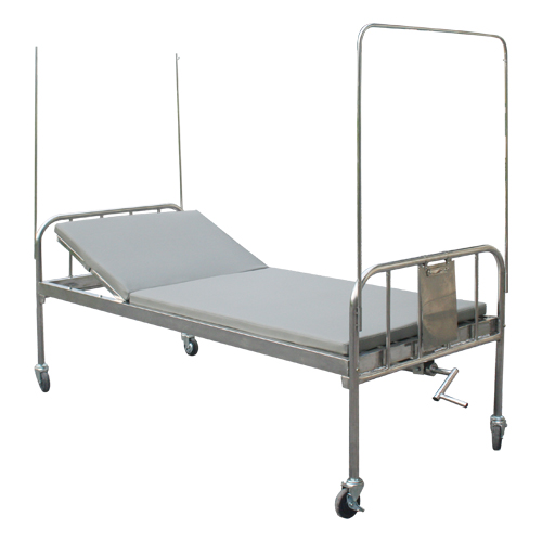 Giường y tế khung Inox, phần đầu giường có thể nâng hạ bằng cơ cấu tay quay, chân có bánh xe.