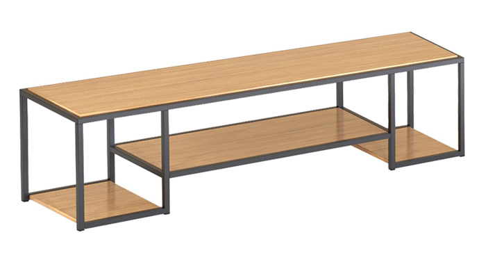 Kiểu dáng : Kệ tivi khung thép sơn đen nhám kết hợp mặt bàn và đợt để đồ bằng gỗ công nghiệp dán giấy vân gỗ.