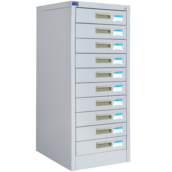 Tủ sắt sơn tĩnh điện gồm 10 ngăn kéo chuyển động bằng cơ cấu ray thép uốn. Các ngăn kéo dùng chung 1 thanh khóa dàn.