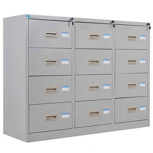 Tủ sắt sơn tĩnh điện gồm 3 khoang, mỗi khoang có 4 ngăn kéo, dùng chung 1 thanh khóa dàn.