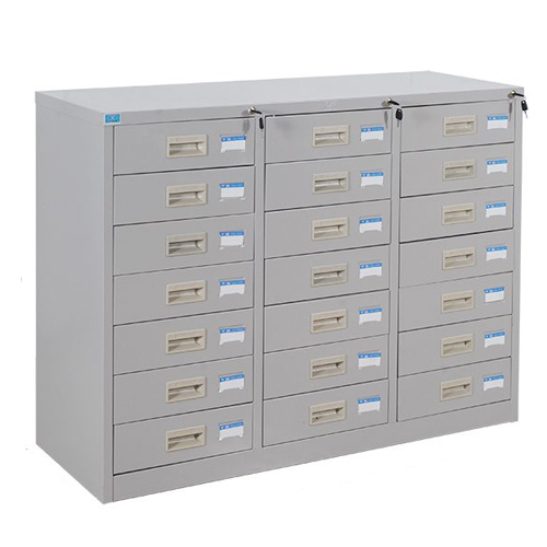 Tủ sắt sơn tĩnh điện gồm 3 khoang, mỗi khoang có 7 ngăn kéo, dùng chung 1 thanh khóa dàn.