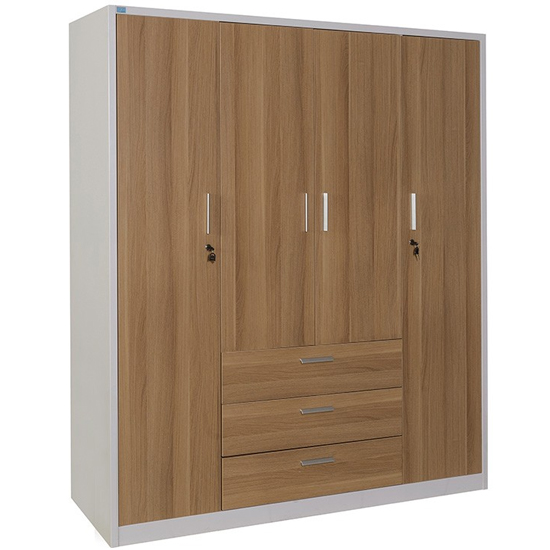 Tủ khung thép cao cấp sơn tĩnh điện màu trắng S26 kết hợp với cánh gỗ công nghiệp phủ Melamine màu M60. Tủ gồm 4 cánh mở và 3 ngăn kéo. Mỗi khoang cánh mở có 1 dợt di động, khoang cánh mở ngoài cùng bên phải có thêm 1 ngăn để đồ sử dụng khóa locker.
