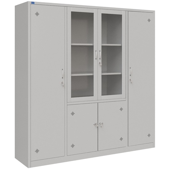 Tủ sắt sơn tĩnh điện gồm 4 khoang: 1 khoang cánh kính mở có 2 đợt di động, 1 khoang gồm hai cánh sắt mở có vách dọc, 2 khoang cánh sắt dài 2 bên trong có 1 suốt treo quần áo, 2 đợt cố định