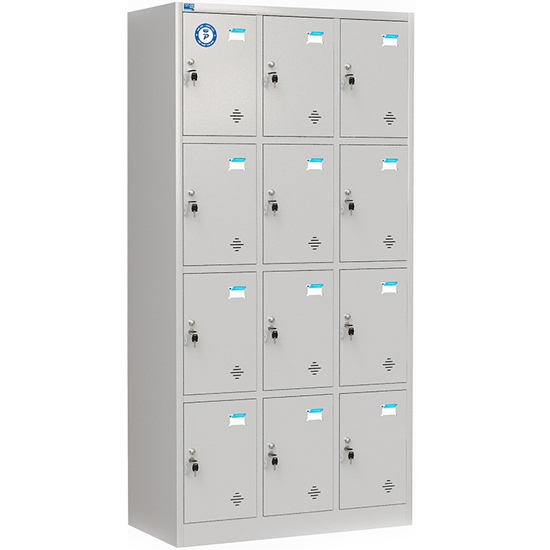 Tủ sắt sơn tĩnh điện 12 khoang cánh mở. Trên mỗi cánh có 1 khóa Locker, núm tay nắm và tai khóa móc.
