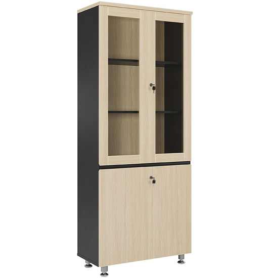 Tủ tài liệu 2 buồng gỗ Melamine, phía trên là 3 khoang cánh khung kính để tài liệu, phía dưới là hai khoang cánh mở. Sử dụng tay nắm vát cạnh và có khóa