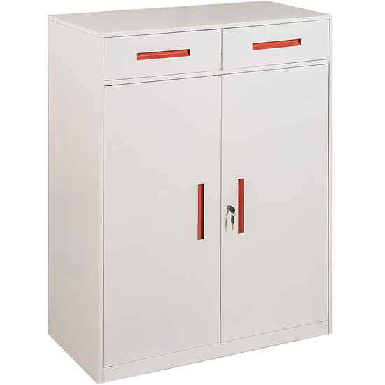 Tủ sắt sơn tĩnh điện màu trắng S26, tay nắm âm màu cam Tủ có 2 khoang, khoang trên có 2 ngăn kéo, khoang duới 2 cánh mở có 2 đợt di động. chia thành 3 tầng để tài liệu. Tủ phù hợp với không gian văn phòng hiện đại
